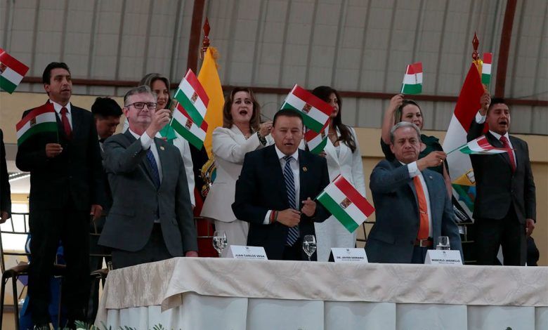 El alcalde Serrano llegó pasadas las 11:00 al coliseo Tipo Mil para dirigir este acto que duró por más de dos horas. Lo acompañaron Marcelo Jaramillo, prefecto del Cañar, y, Juan Carlos Vega, ministro de Economía y Finanzas como delegado de Daniel Noboa, presidente de la República.